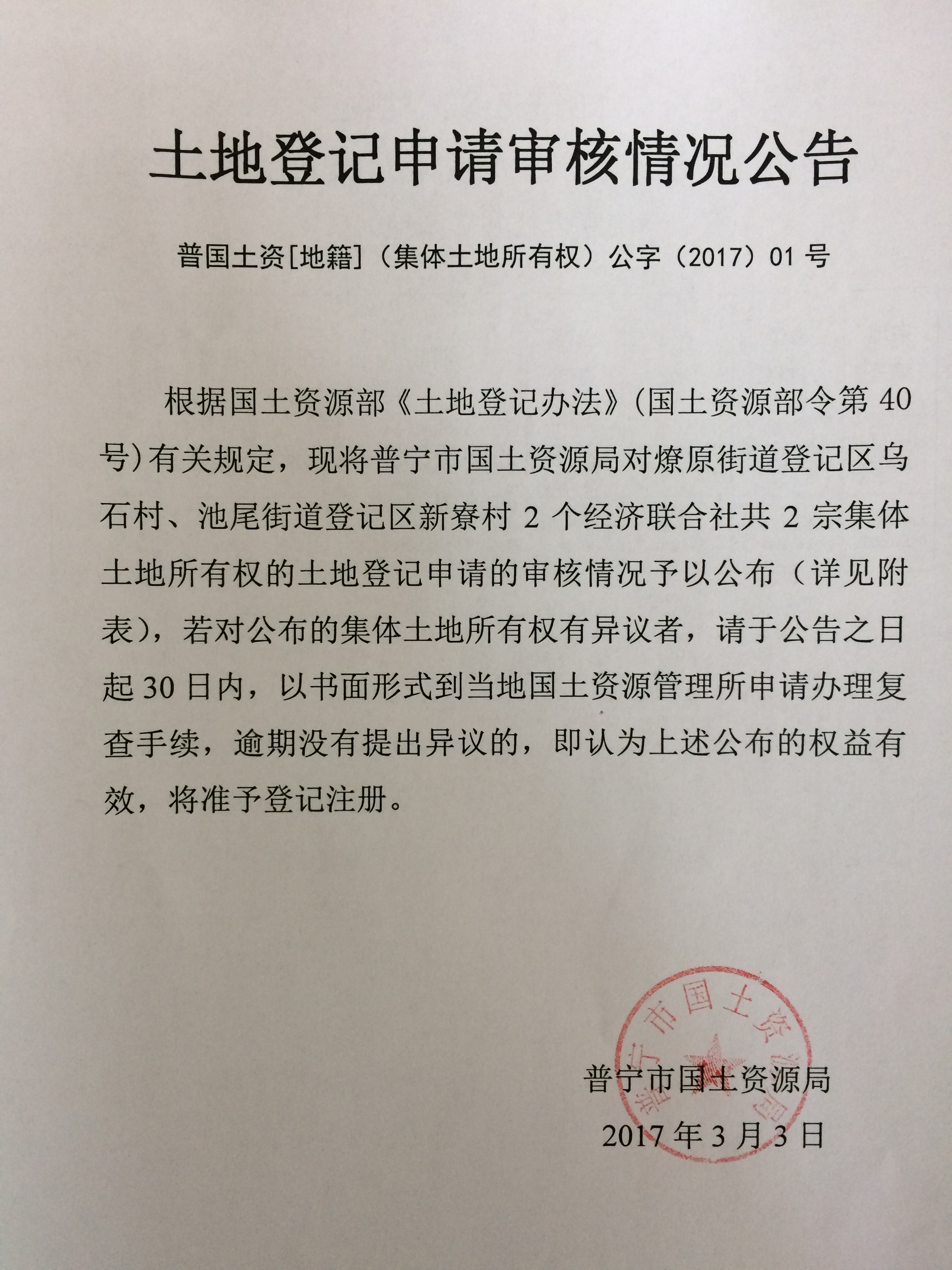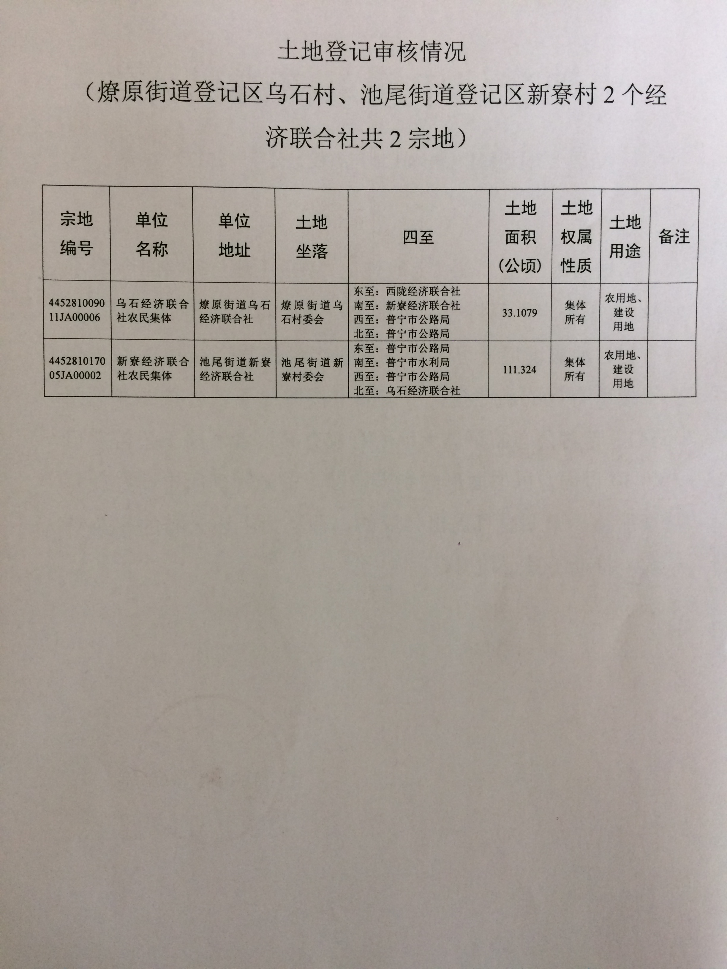 土地登记申请审核情况公告(乌石、新寮)