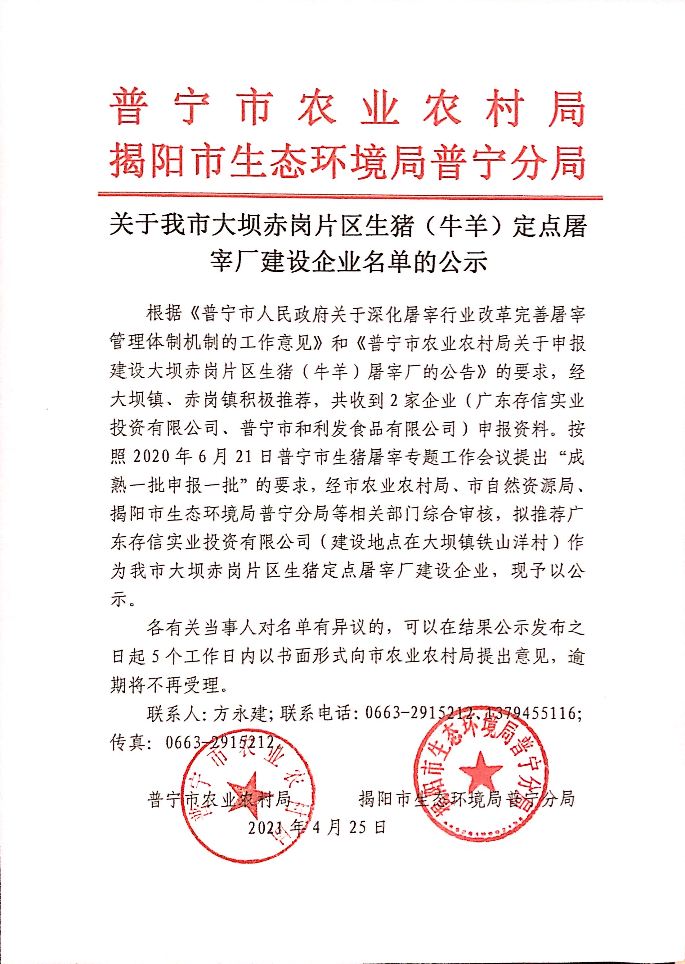 根据《普宁市人民政府关于深化屠宰行业改革完善屠宰管理体制机制的工作意见》和《普宁市农业农村局关于申报建设大坝赤岗片区生猪(牛羊)屠宰厂的公告》的要求,经大坝镇、赤岗镇积极推荐,共收到2家企业(广东存信实业投资有限公司、普宁市和利发食品有限公司)申报资料。按照2020年6月21日普宁市生猪屠宰专题工作会议提出“成熟一批申报一批”的要求,经市农业农村局、市自然资源局、揭阳市生态环境局普宁分局等相关部门综合审核,拟推荐广东存信实业投资有限公司(建设地点在大坝镇铁山洋村)作为我市大坝赤岗片区生猪定点屠宰厂建设企业,现予以公示。