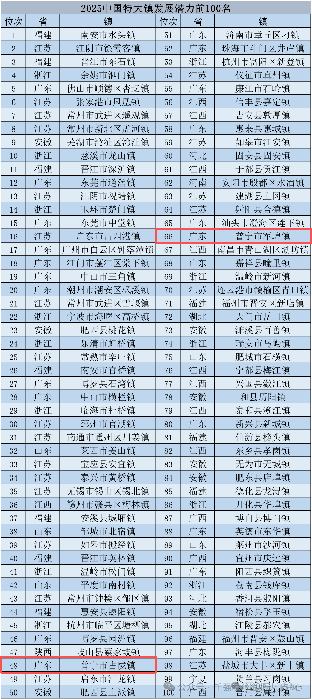 普宁有2个镇上榜,其中占陇镇入围2025年中国特大镇发展潜力前100名,排名48位;军埠镇入围2025年中国特大镇发展潜力前100名,排名66位。