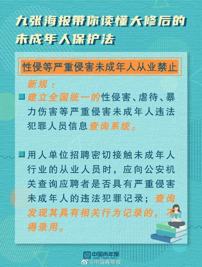 新修订的未成年人保护法增设了发现未成年人权益受侵害时强制报告制度,以及密切接触未成年人行业从业人员的准入资格制度。此外,国家还将建立性侵害、虐待、拐卖、暴力伤害等违法犯罪人员信息查询系统,向密切接触未成年人的单位提供免费查询服务。
