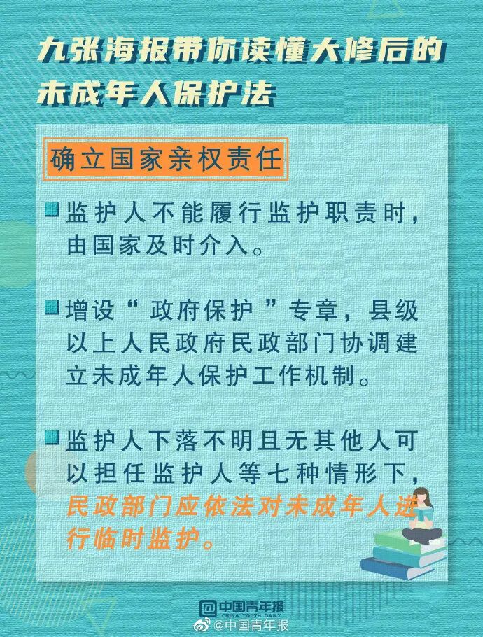 新修订的未成年人保护法明确了国家监护制度,规定在未成年人的监护人不能履行监护职责时,由国家承担监护职责。