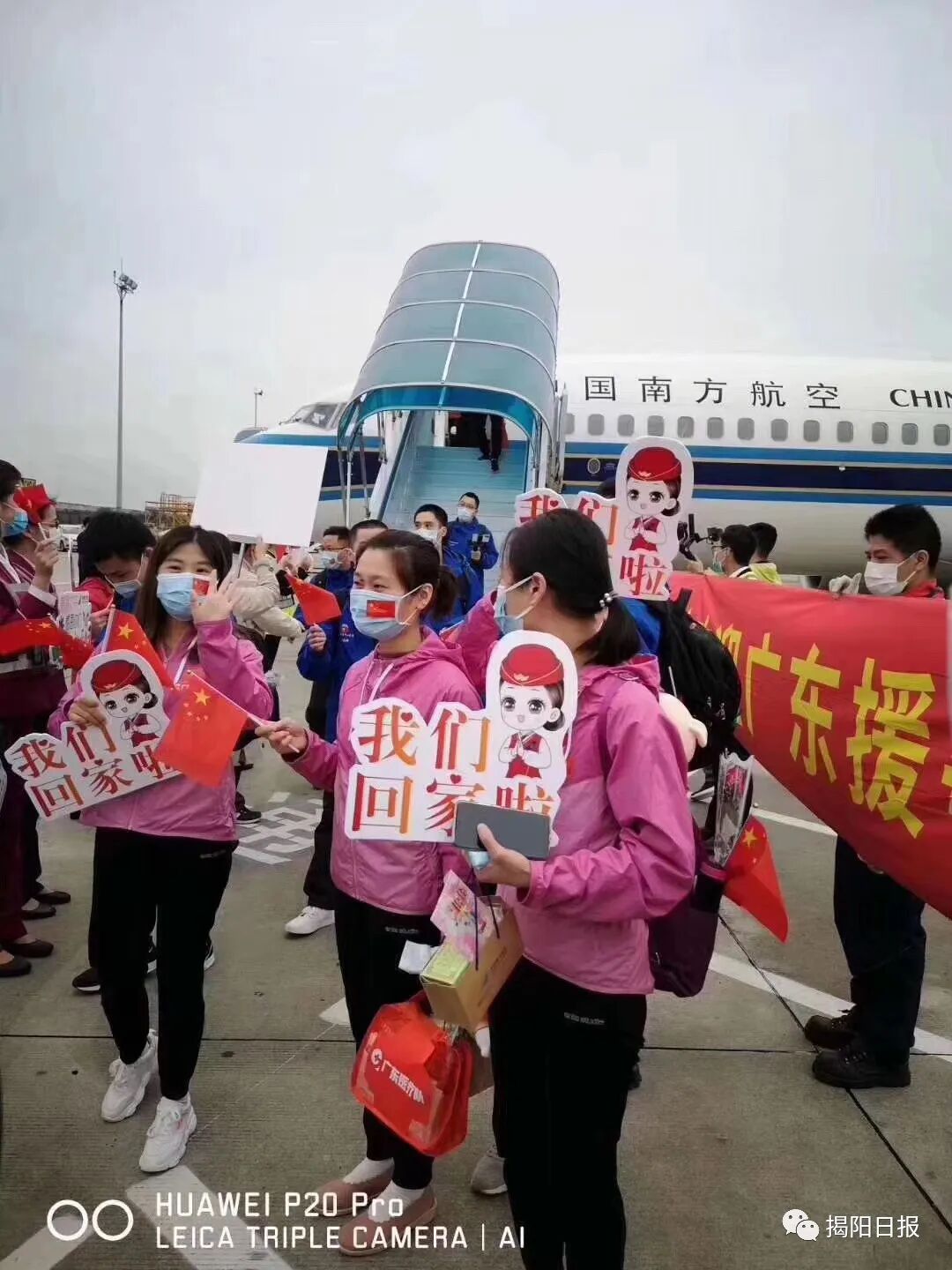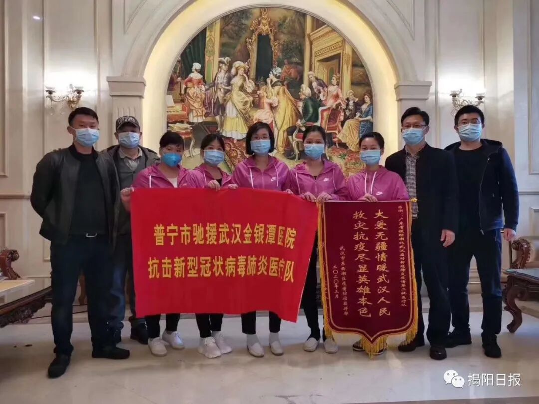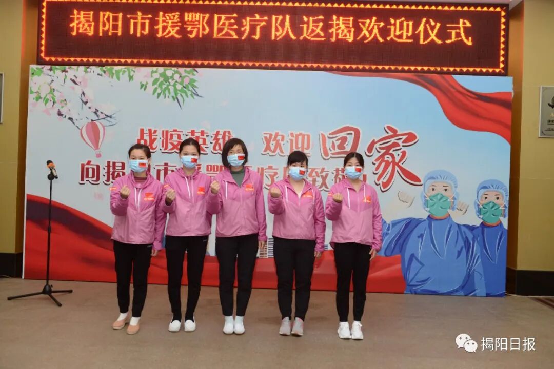 经过60余个日夜的奋战,揭阳市首批援鄂的普宁市人民医院神经内科黄妙珊、方乔、方洁玫、方瑜、温玉枝5名医疗队员圆满完成了支援使命,于昨晚平安返揭。揭阳市组织开展欢迎仪式迎接5名“白衣战士”回家。