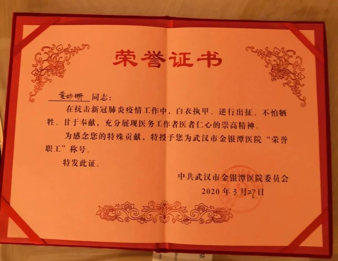 她们精湛的技术和细致的服务受到了上级领导和其他地市医疗队同行的高度称赞。3月5日,国家卫生健康委、人力资源社会保障部、国家中医药管理局发布关于表彰全国卫生健康系统新冠肺炎疫情防控工作先进集体和先进个人的决定,广东5个集体22名个人获奖,其中,黄妙珊获“全国卫生健康系统新冠肺炎疫情防控工作先进个人”。3月27日,中共武汉市金银潭医院委员会向黄妙珊、方乔、方洁玫、方瑜、温玉枝分别授予“荣誉职工”称号。