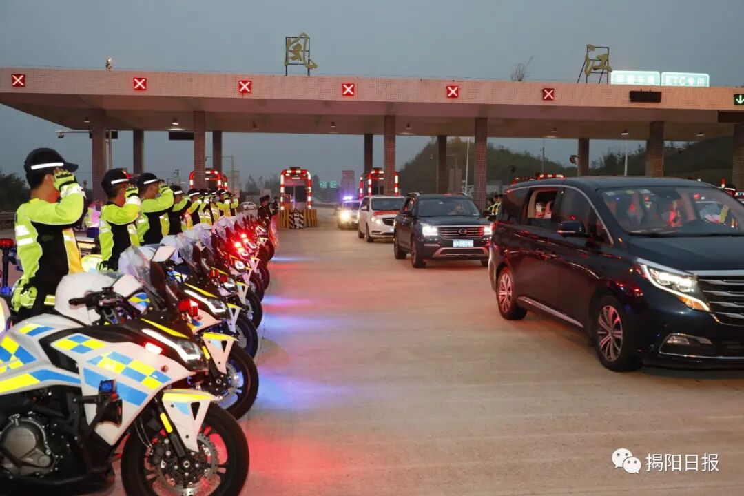 昨天傍晚18时许,当载着黄妙珊等5名援鄂医疗队员的车队驶出揭西县凤江高速路口时,等待在旁的揭阳市交警支队的铁骑车队随即鸣笛亮灯,随车警员纷纷向她们敬礼。