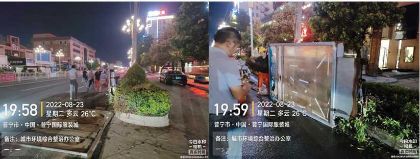 市容股及时组织工作人员清理广达北路、北环大道西倒地的广告牌、路灯牌,确保道路畅通。