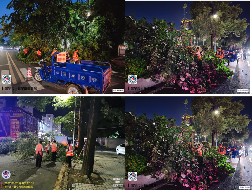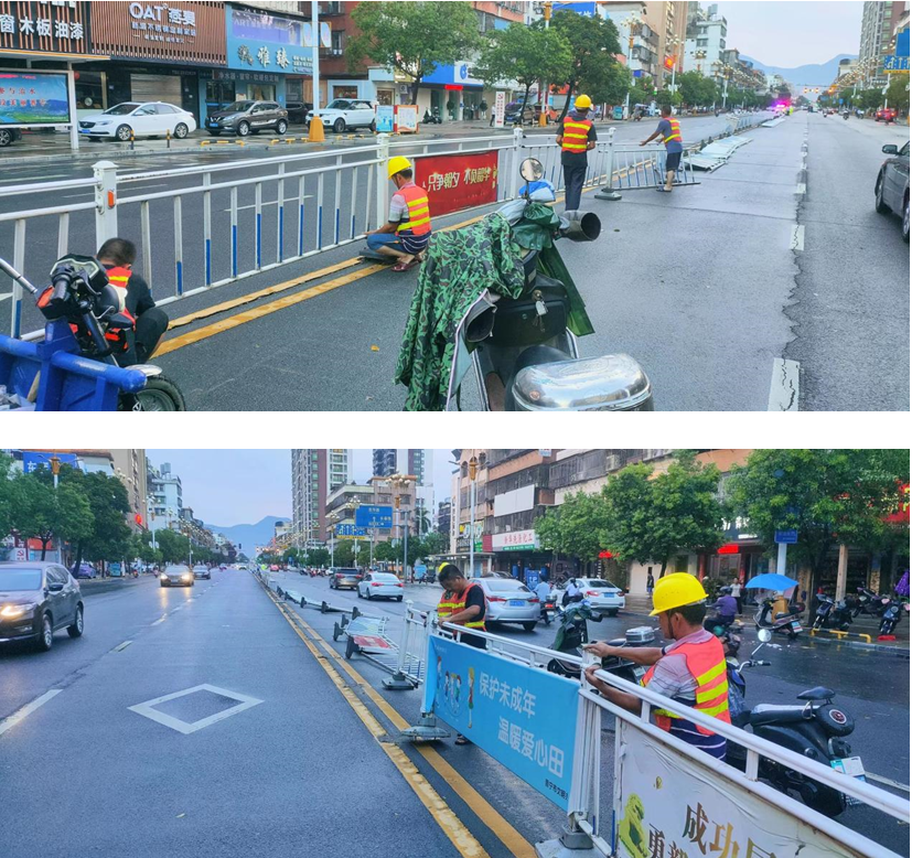 市区广达北路嘉应华府路段、流沙大道文竹路口、广达南路红绿灯路口处、流沙大道供电局门口、南华路等多处道路隔离栏被大风吹倒,市城管执法局管养站迅速组织人员抢修加固损坏倾倒的道路护栏,至23日21时30分,市城管执法局管辖范围内损坏倾倒的道路隔离栏,已全部完成应急抢修。