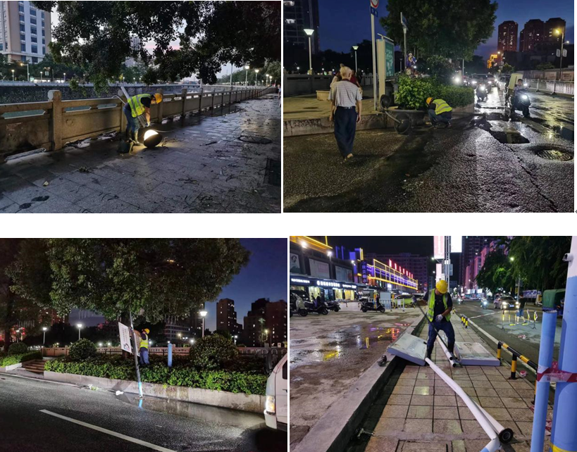 市城管执法局巡查组人员第一时间对市区排水管网、雨水口等排水设施进行全面检查,及时疏通被树叶、淤泥、垃圾堵塞的雨水井,巡查发现有破损井盖的立即上报并通知有关部门迅速修复,全面排除安全隐患,保障市区排洪需要;加强对市区路灯杆及路灯控制箱的巡查,对倾斜的路灯杆进行检查修复,严防漏电伤人事故发生;对户外广告、户外设施、店招店牌进行电路短路漏电、锈蚀松动、固定件脱落等安全隐患检测排查,对存在问题的立即整改;组织园林处对市区道路树木进行巡查,进行修枝剪枝,避免树枝折落误伤人员。