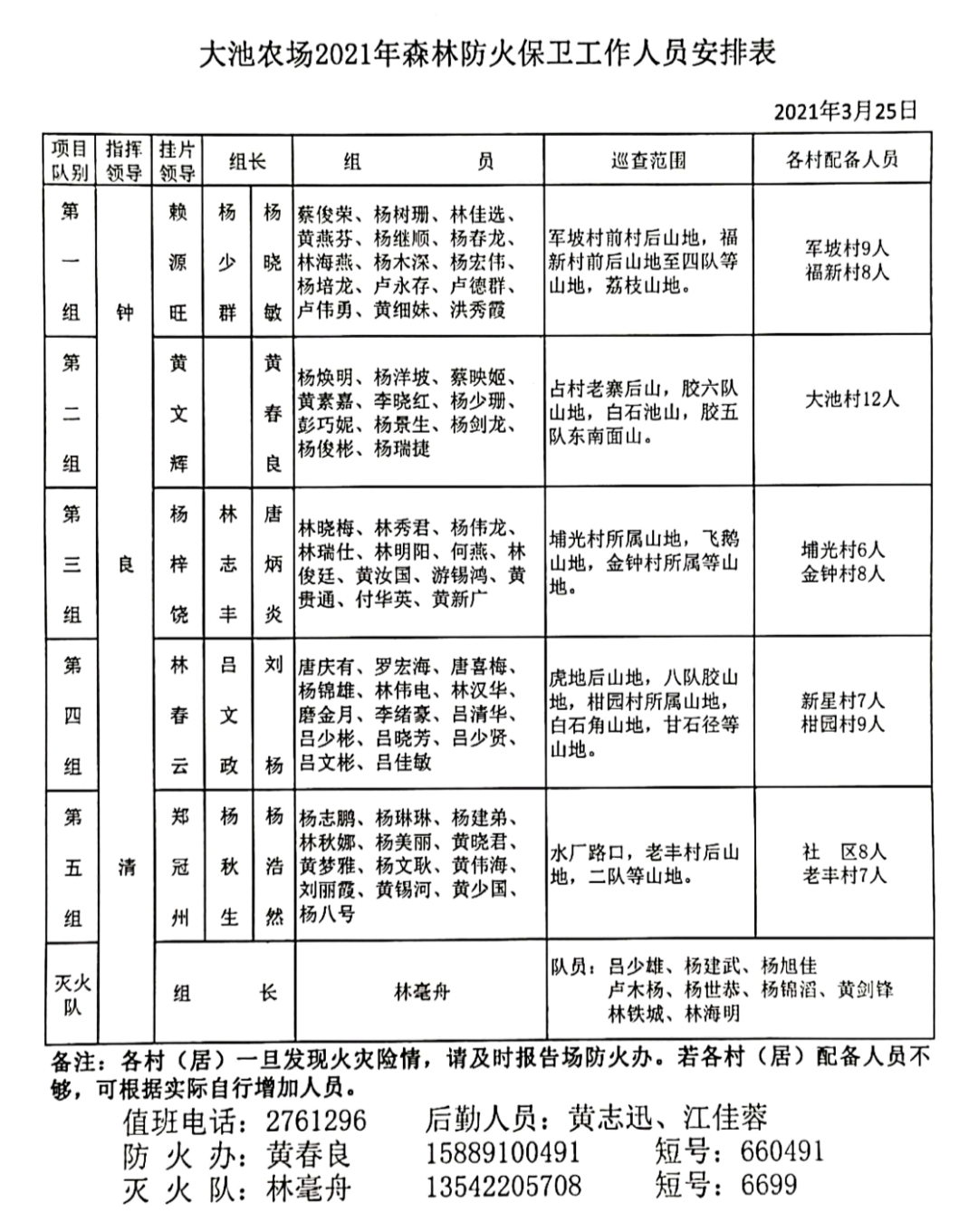 为切实加强清明节农场的森林防火工作,根据市委市政府林业 工作会议精神要求。经研究,决定成立大池农场清明节森林防火指挥部,其成员名单如下: