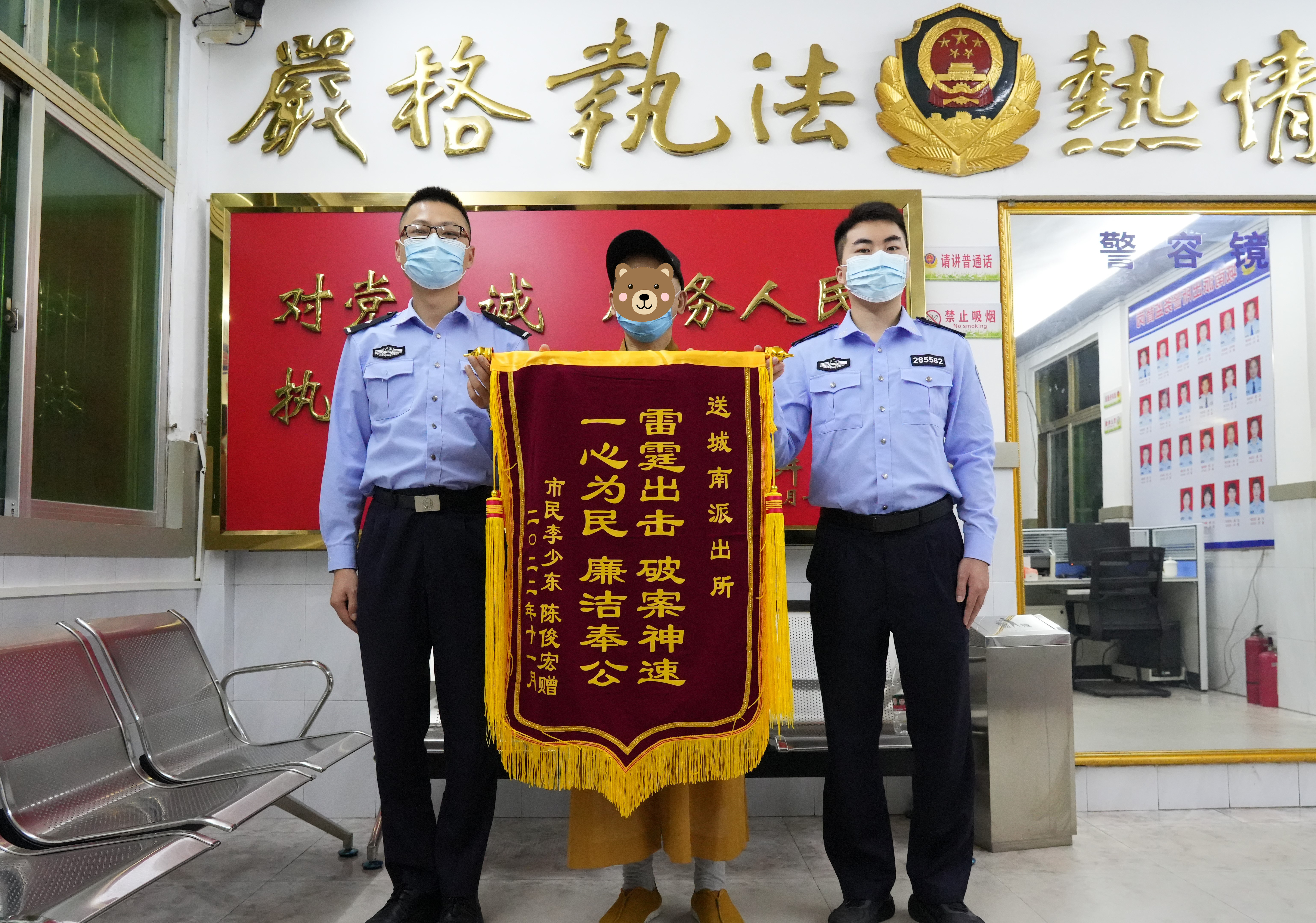 11月14日下午,一事主(潮州市一庵寺主持)专程来到普宁市公安局城南派出所,向民警赠送“雷霆出击 破案神速 一心为民 廉洁奉公”锦旗一面,连声称赞公安机关快速破案追赃,及时抓获犯罪分子,追回其被诈骗钱财。该主持紧握民警双手激动地说:“感谢你们,你们辛苦了!”