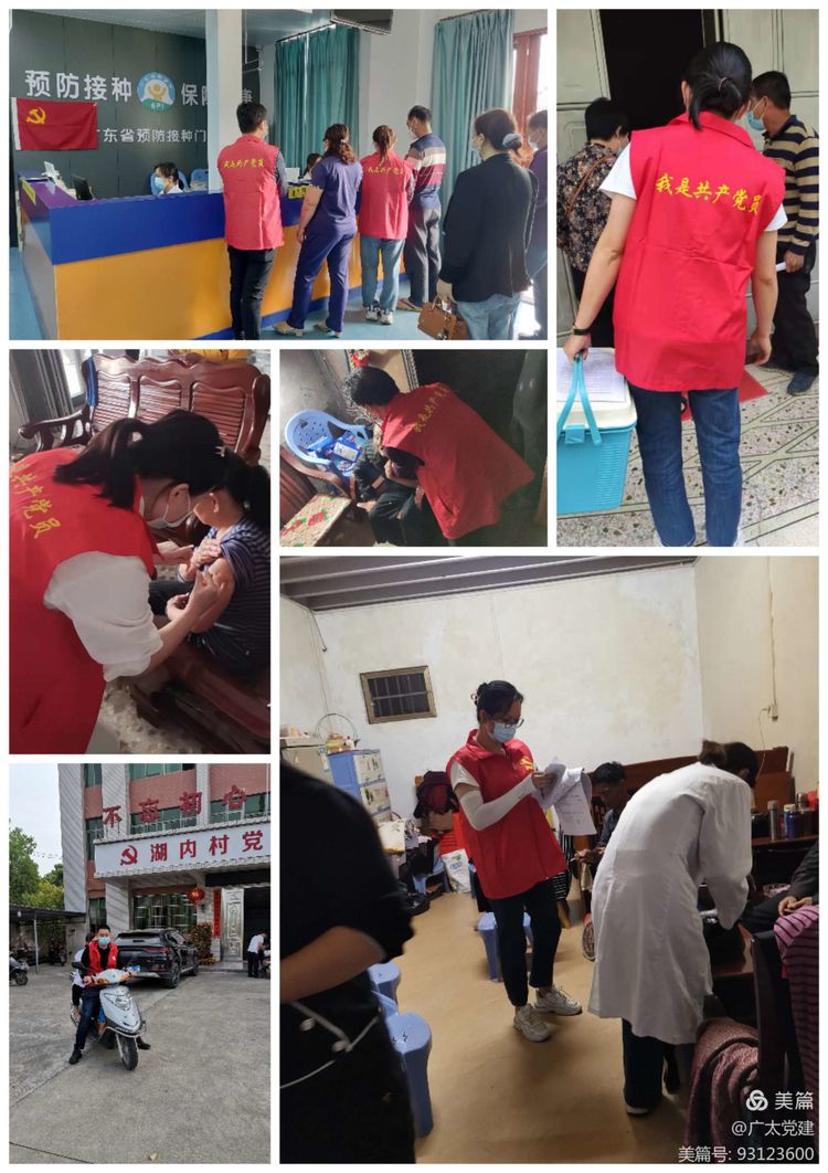 在疫情防控最前沿,各临时党支部统一悬挂党旗,组建党员志愿队,划定党员责任区,设立党员先锋岗,切实带领群众做好疫情防控工作。最值得一提的是设立于广太镇卫生院的广太镇疫情防控党员先锋队临时党支部。在该临时党支部的引领下,全镇疫苗接种工作强势推进,一方面是党员医护人员带头服务好主动到医院接种疫苗的群众,让他们有序顺利完成疫苗接种;另一方面是负责疫苗接种的党员医护人员带头组成流动疫苗接种小组,下乡进村入户为行动不便的老年人接种疫苗,通过多轮次、滚动式,流动上门接种疫苗,全镇60岁以上人员接种疫苗工作不断取得新成绩,至目前,流动为60岁以上人员接种疫苗超过750人次。