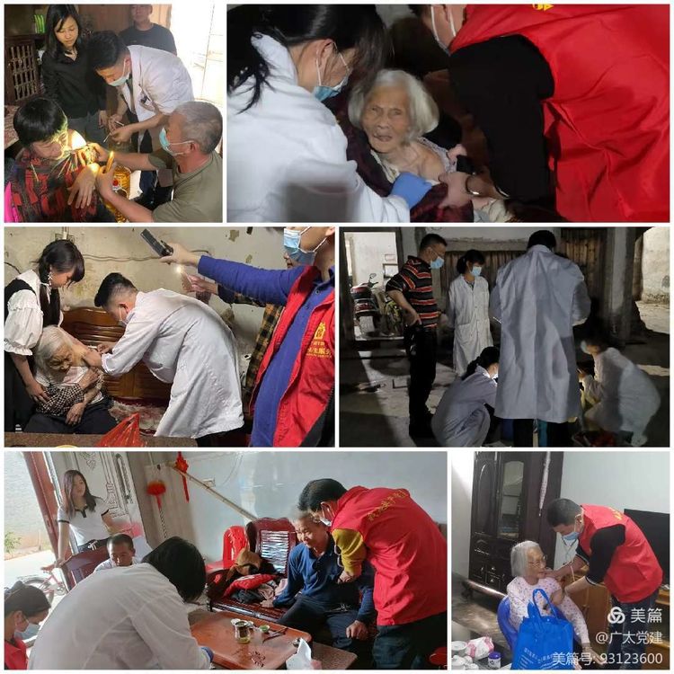 在疫情防控临时党组织的引领下,党员医护人员、基层党员干部日夜兼程,主动放弃周末休息时间,进村入户为行动不便的老人接种疫苗。