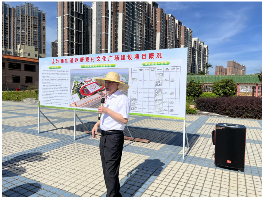 在推进会现场,流沙西街道党工委书记陈会彬介绍了赵寮村文化广场的建设情况。