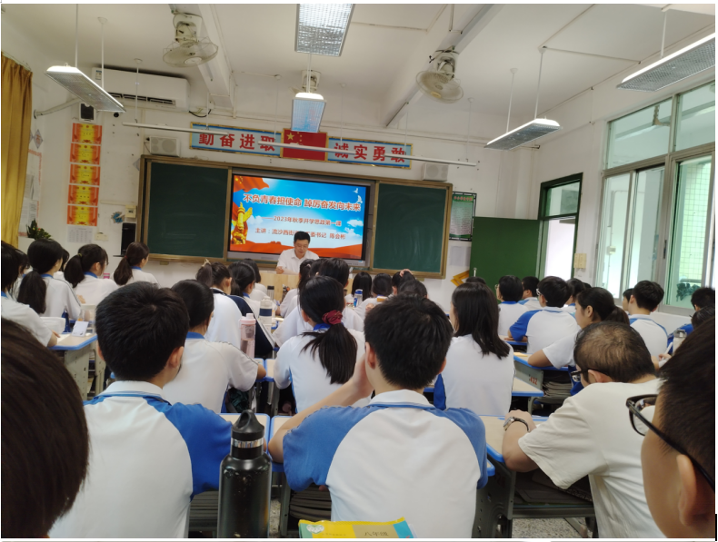 新学期迎来新气象,新希望开启新征程。为全面落实立德树人的根本任务,引导广大学生树立正确的世界观、人生观、价值观,2023年9月26日下午,流沙西街道党工委书记陈会彬到城西中学为同学们上开学思政第一课。流沙西街道人大工委主任张廷建、教育组负责人赖建强、城西中学领导及部分师生代表聆听了思政课。