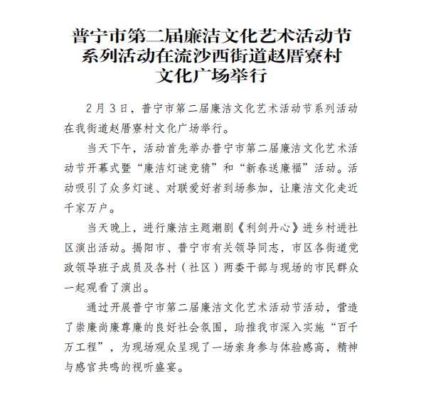 普宁市第二届廉洁文化艺术活动节系列活动在流沙西街道赵厝寮村文化广场举行