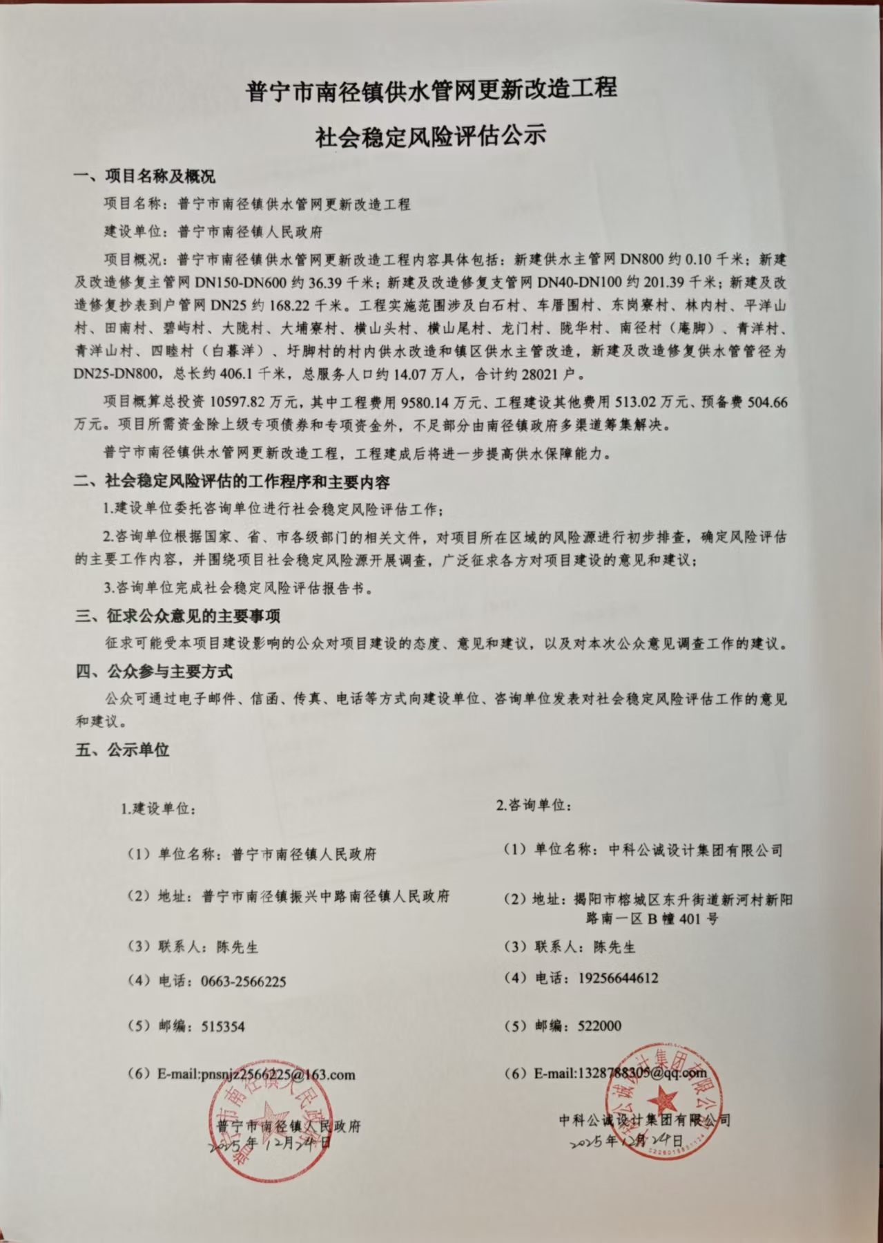 普宁市南径镇供水管网更新改造工程 社会稳定风险评估公示