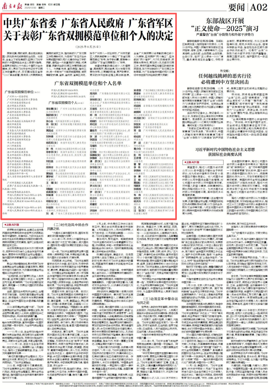 拥军优属、拥政爱民,是我党我军我国人民优良传统和特有政治优势。近年来,全省上下和驻粤部队坚持以习近平新时代中国特色社会主义思想为指导,全面贯彻党的二十大和二十届历次全会精神,深入贯彻习近平总书记关于双拥工作的重要论述,紧紧围绕落实省委“1310”具体部署,持续深入开展拥军优属拥政爱民工作,推动新时代广东双拥工作取得新成效,为促进广东经济社会发展和国防军队现代化建设作出了积极贡献,涌现出一大批富有时代特色、成绩显著、贡献突出的双拥工作模范单位和个人。为表彰先进、宣扬典型、推动工作,进一步激发广大军民爱国拥军、爱民奉献的热情,省委、省政府、省军区决定,授予广州市八一实验学校、广州市花都区人民武装部等38个单位“广东省双拥模范单位”称号,授予季彩霞、常强等69名同志“广东省双拥模范个人”称号。
