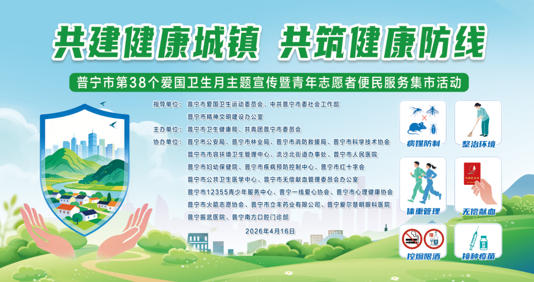 春风送暖,健康相伴。为深入贯彻习近平总书记关于健康中国建设和爱国卫生工作的重要指示批示精神,进一步广泛动员群众,深入推进爱国卫生运动,营造健康生活环境,提升全民健康素养,筑牢全民健康防线,我市将于4月16日(星期四)上午在普宁兰花广场举办第38个爱国卫生月主题宣传暨青年志愿者便民服务集市活动。本次活动以“共建健康城镇 共筑健康防线”为主题,内容丰富、形式多样,期待广大市民朋友踊跃参与,一起为健康普宁助力!