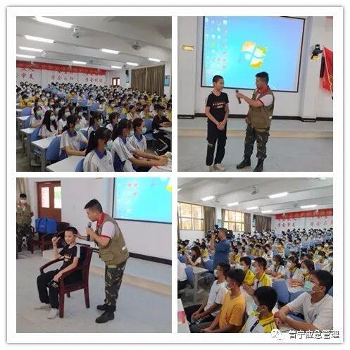 市应急管理局、市红十字会、市教育局、市气象局、市卫健局相关负责人及陈宝文学校领导出席本次活动,在场师生共计三百余人参与本次活动。活动邀请了普宁市红十字会培训师陈徐琛为大家现场演示急救方法,包括防溺水、中暑、止血、简单包扎等常见急症及意外伤害的处理演示。活动现场,培训师陈徐琛邀请了一位学生上台配合,给大家做止血包扎示范的动作,同时和学生们进行现场互动,整个活动现场,学生们响应积极。