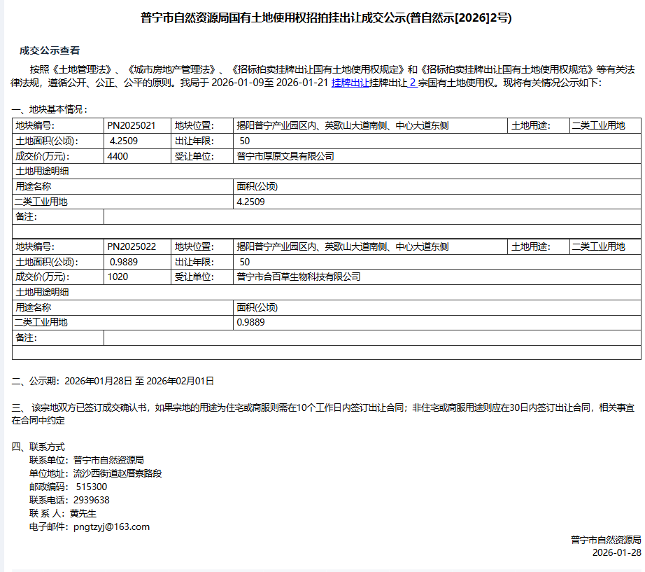 普宁市自然资源局国有土地使用权招拍挂出让成交公示(普自然示[2026]2号)