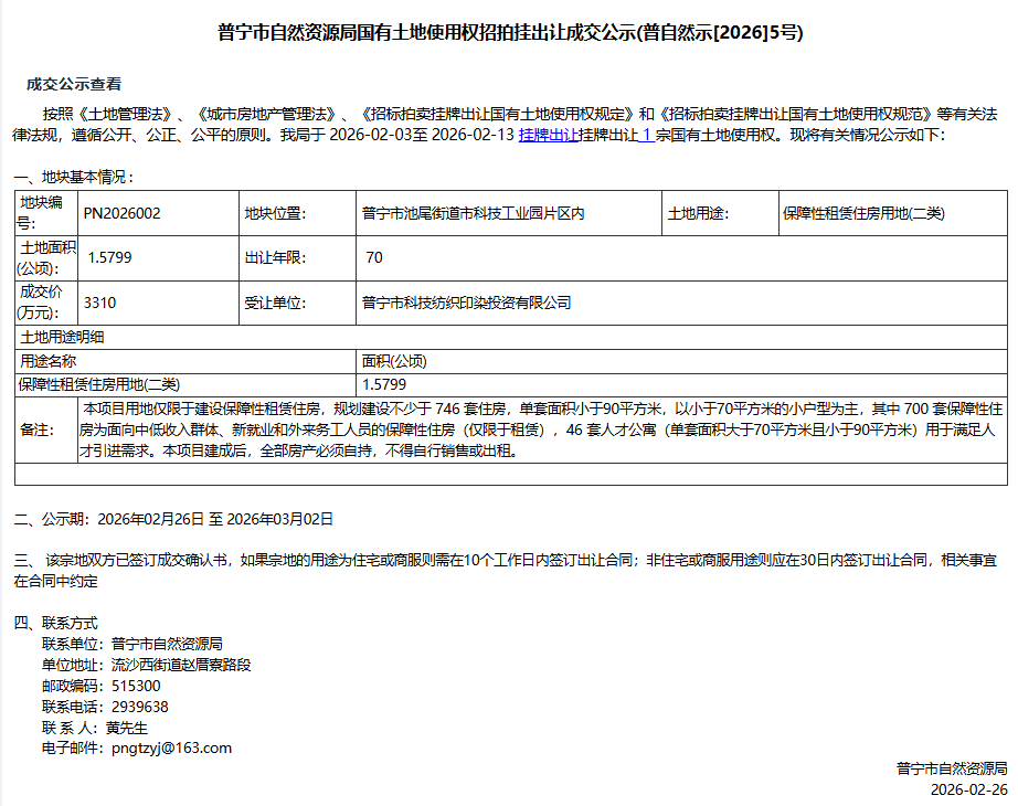 普宁市自然资源局国有土地使用权招拍挂出让成交公示(普自然示[2026]5号)