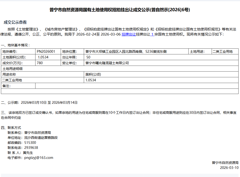 普宁市自然资源局国有土地使用权招拍挂出让成交公示(普自然示[2026]6号)