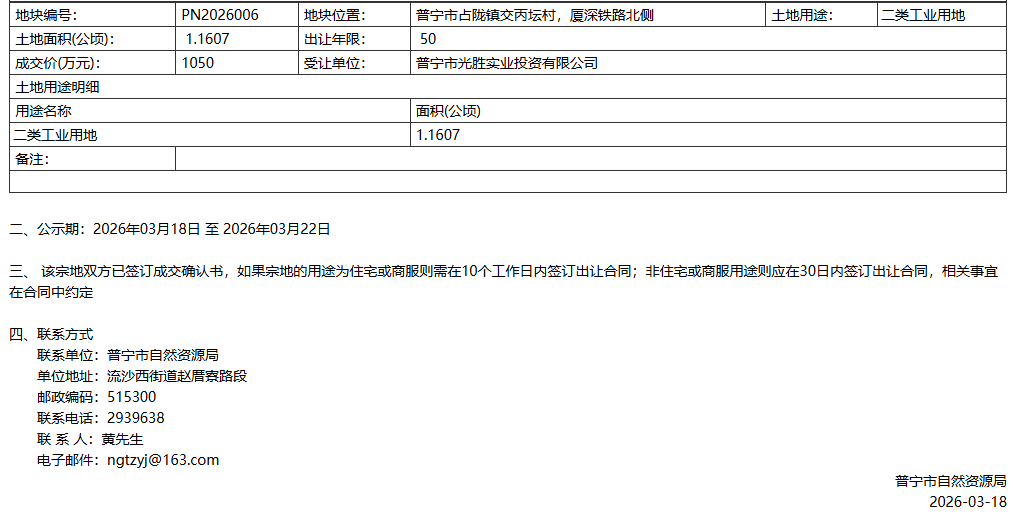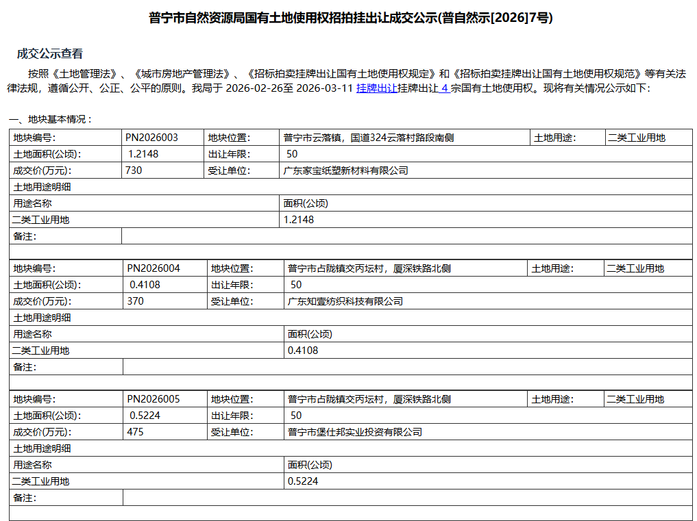 普宁市自然资源局国有土地使用权招拍挂出让成交公示(普自然示[2026]7号)