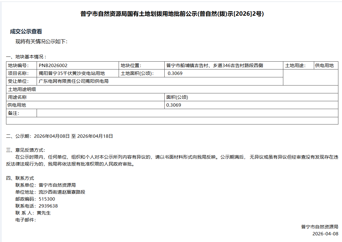 普宁市自然资源局国有土地划拨用地批前公示 (普自然(拨)示〔2026〕2号)