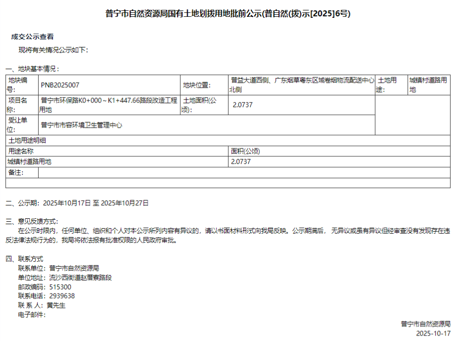 普宁市自然资源局国有土地划拨用地批前公示 (普自然(拨)示〔2025〕6号)