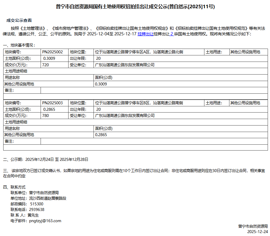 普宁市自然资源局国有土地使用权招拍挂出让成交公示(普自然示[2025]11号)
