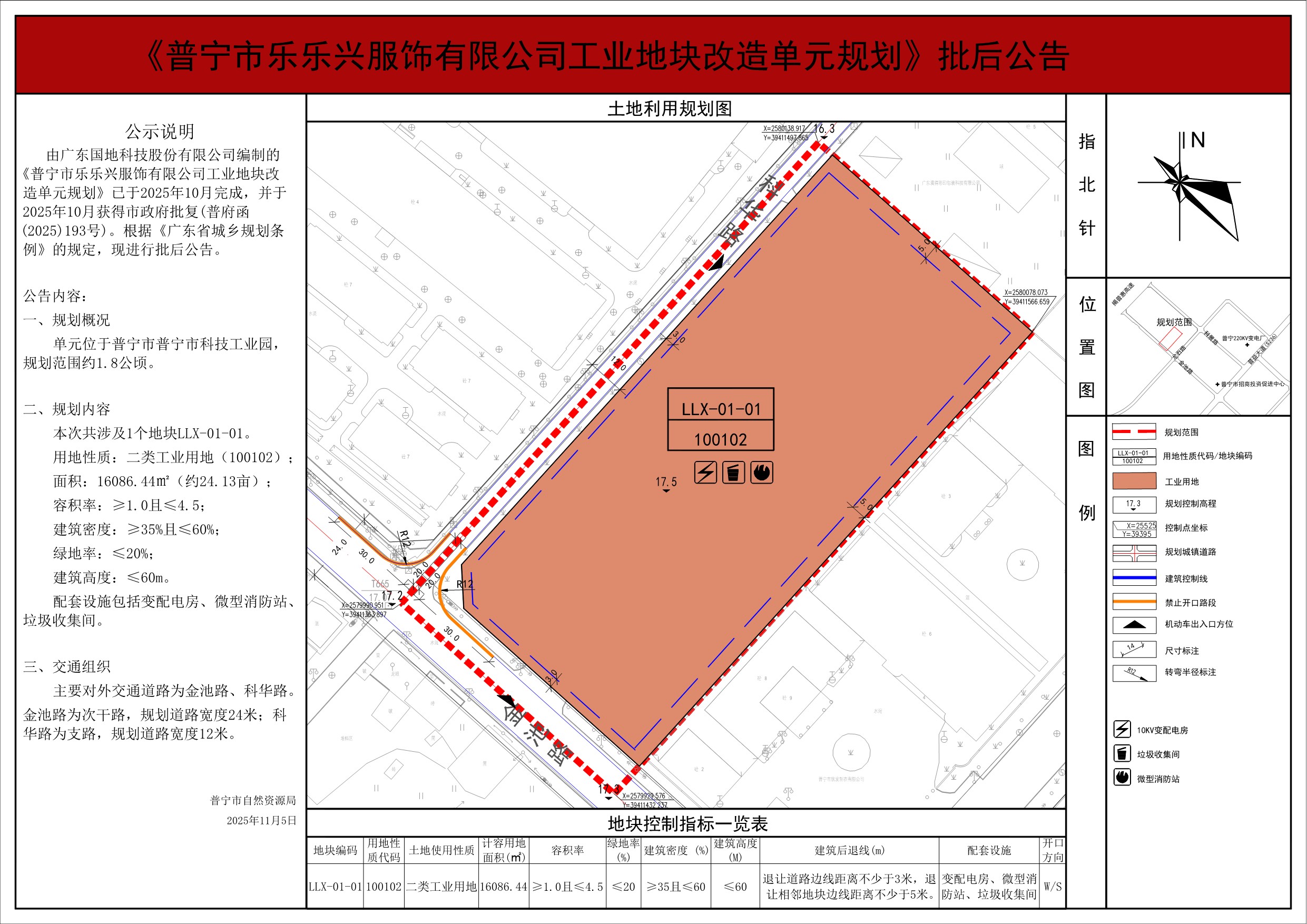 《普宁市乐乐兴服饰有限公司工业地块改造单元规划》批后公告