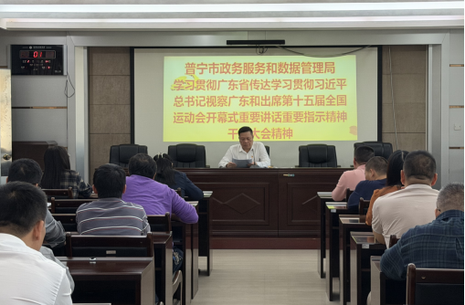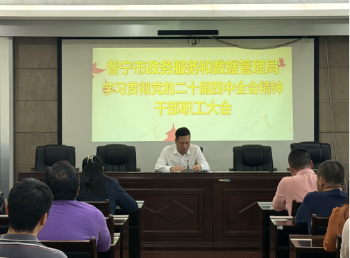 11月14日,市政务服务和数据管理局召开全体干部职工大会,传达学习贯彻习近平总书记在党的二十届四中全会上的重要讲话和全会精神和我市相关干部大会精神,以及习近平总书记视察广东和出席第十五届全国运动会开幕式的重要讲话重要指示精神,动员全体干部职工深刻领会习近平总书记的重要讲话精神和党的二十届四中全会的精神实质,切实把思想和行动统一到党中央决策部署上来,把学习成效不断转化为推进政数工作高质量发展的有效举措和强劲动能。