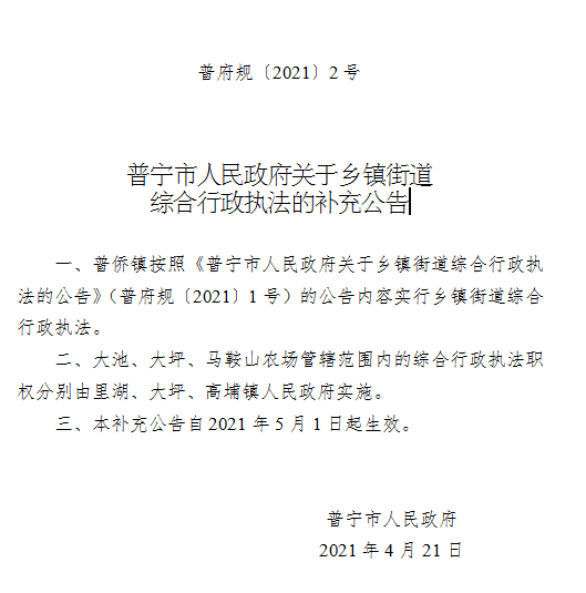 普宁市人民政府关于乡镇街道综合行政执法的补充公告
